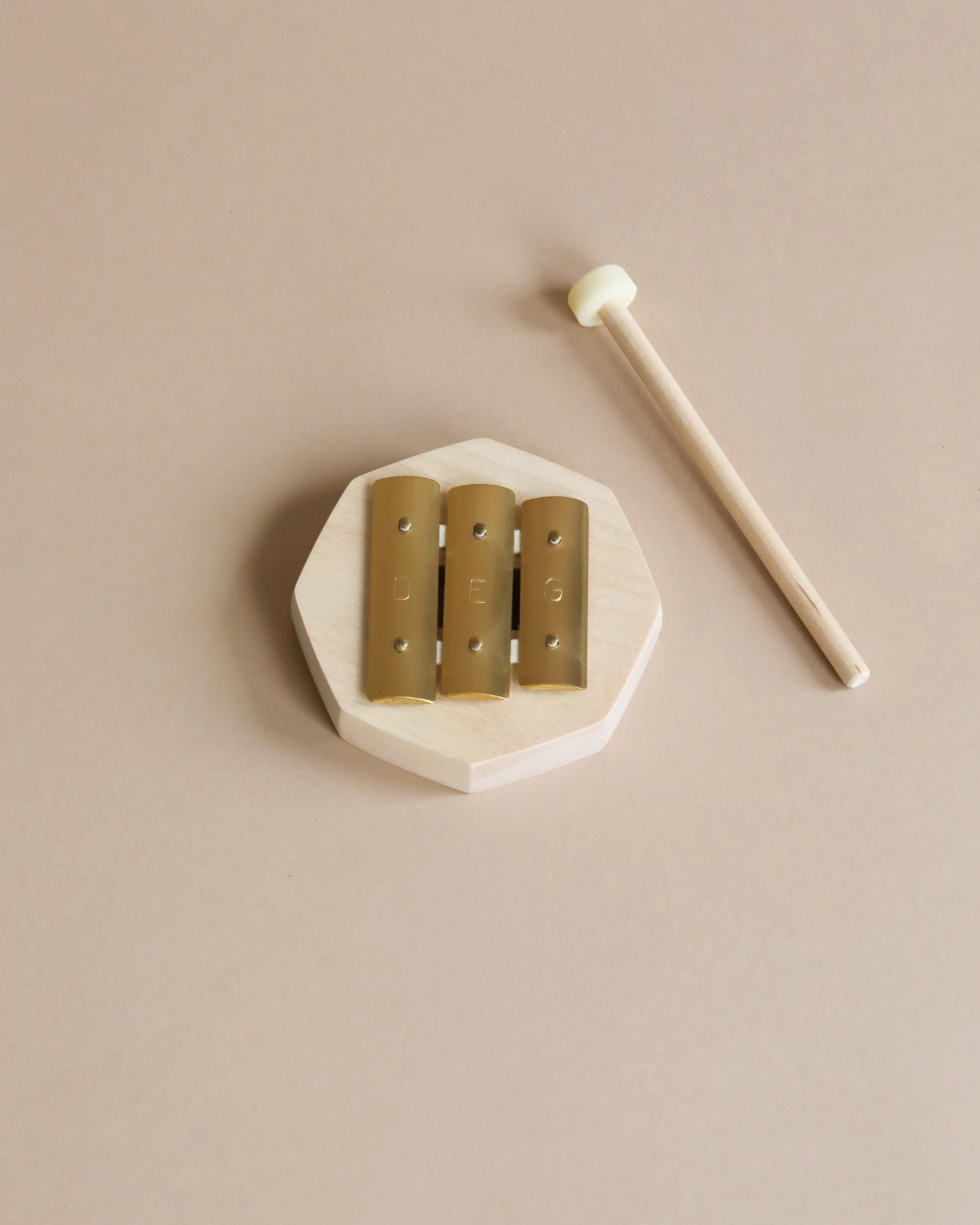 These three-tone glockenspiels use the same tones as are on our Pentatonic Glockenspiel. A simple instrument that fits nicely when playing in groups or for a toddler to begin with. Maple wood, brass plates.