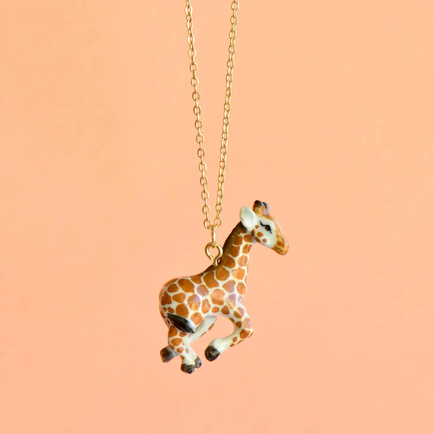 This handcrafted porcelain pendant features a sweet baby giraffe. Strung on a delicate chain, this necklace is a versatile and captivating addition to both casual and elegant looks. Due to the handmade nature of this product, slight variations in color and design may occur, making each piece truly one-of-a-kind. Perfect for fantasy enthusiasts, dragon lovers, or anyone who appreciates the blend of fashion, artistry, and a touch of medieval magic.