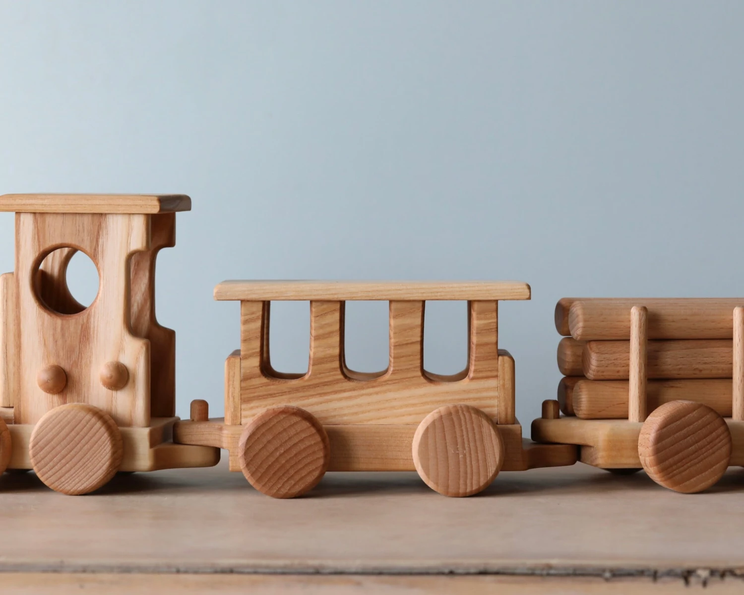 Handmade from beech wood, this set includes the locomotive, one passenger gar and three freight cars.