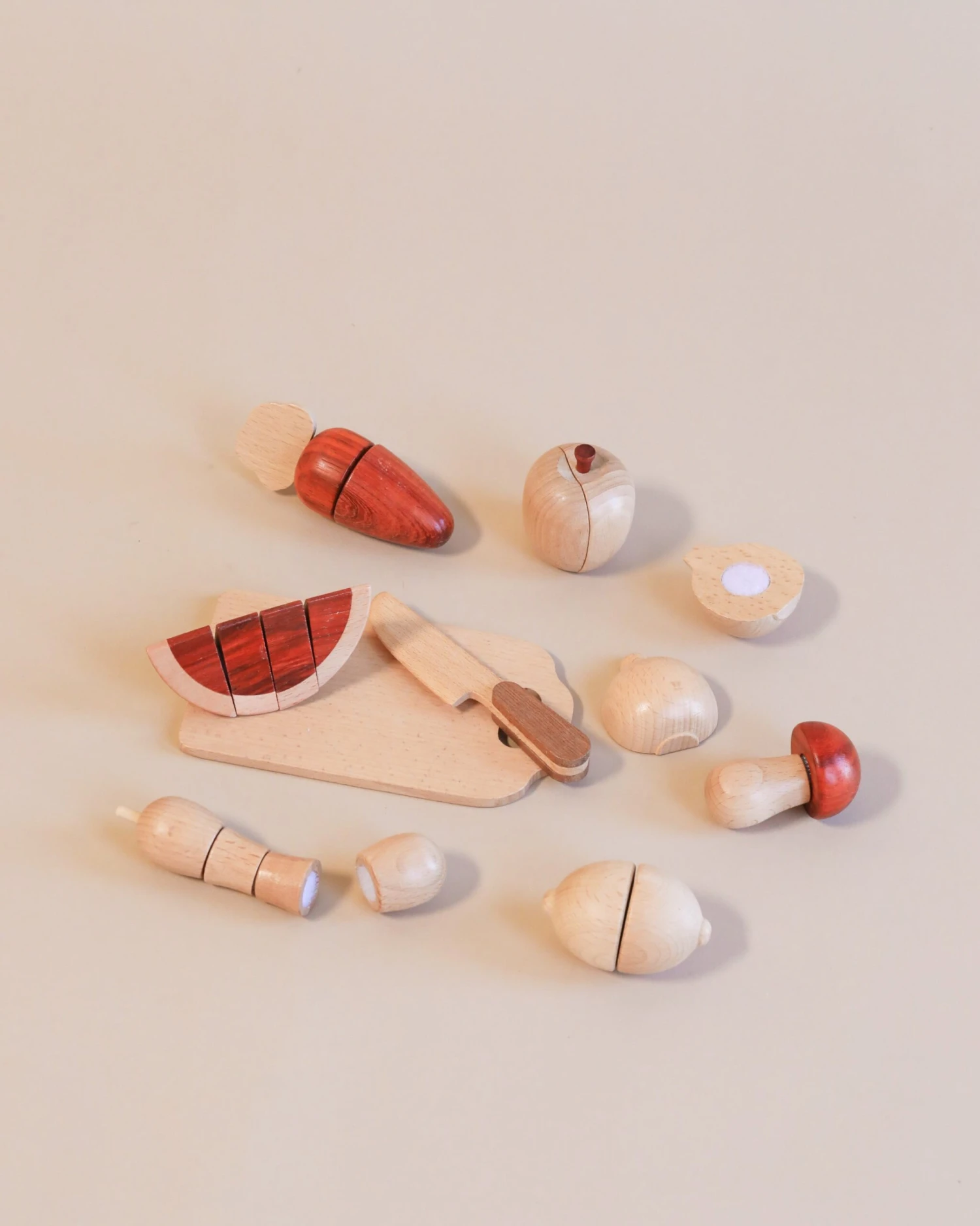 This set contains everything the little chef needs: 7 kinds of pre-cut vegetables, a cutting board and a knife. Made of beech wood.