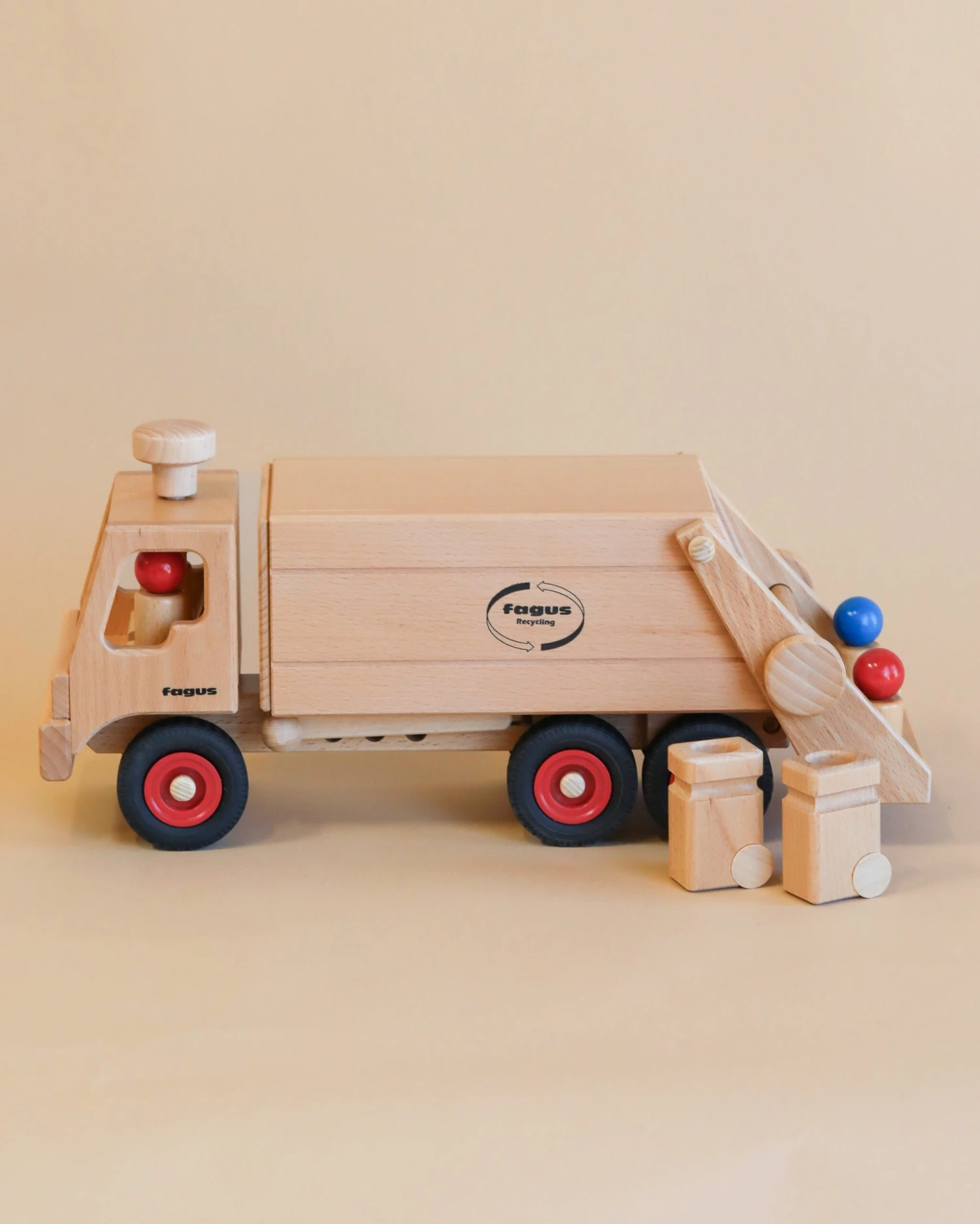 Kids can have fun with this Fagus Wooden Garbage Truck, featuring two removable bins that can be filled and tipped into the truck’s cargo space. Inside is a pair of peg figures, which can be removed for imaginative play. The sturdy structure and real rubber tires make it resistant to wear and tear from driving and construction activities. The wooden toys are handcrafted in a workshop for the disabled using beechwood, with interlocking, doweled, and glued connections. No nails, screws, or staples are used.