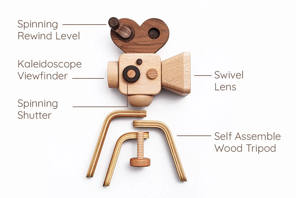 The build-in kaleidoscope viewfinder enhances creativity in children. The Super16 Wooden Toy Camera is designed to fit perfectly in a child’s hand, and it can be double as interior decor with the tripod.