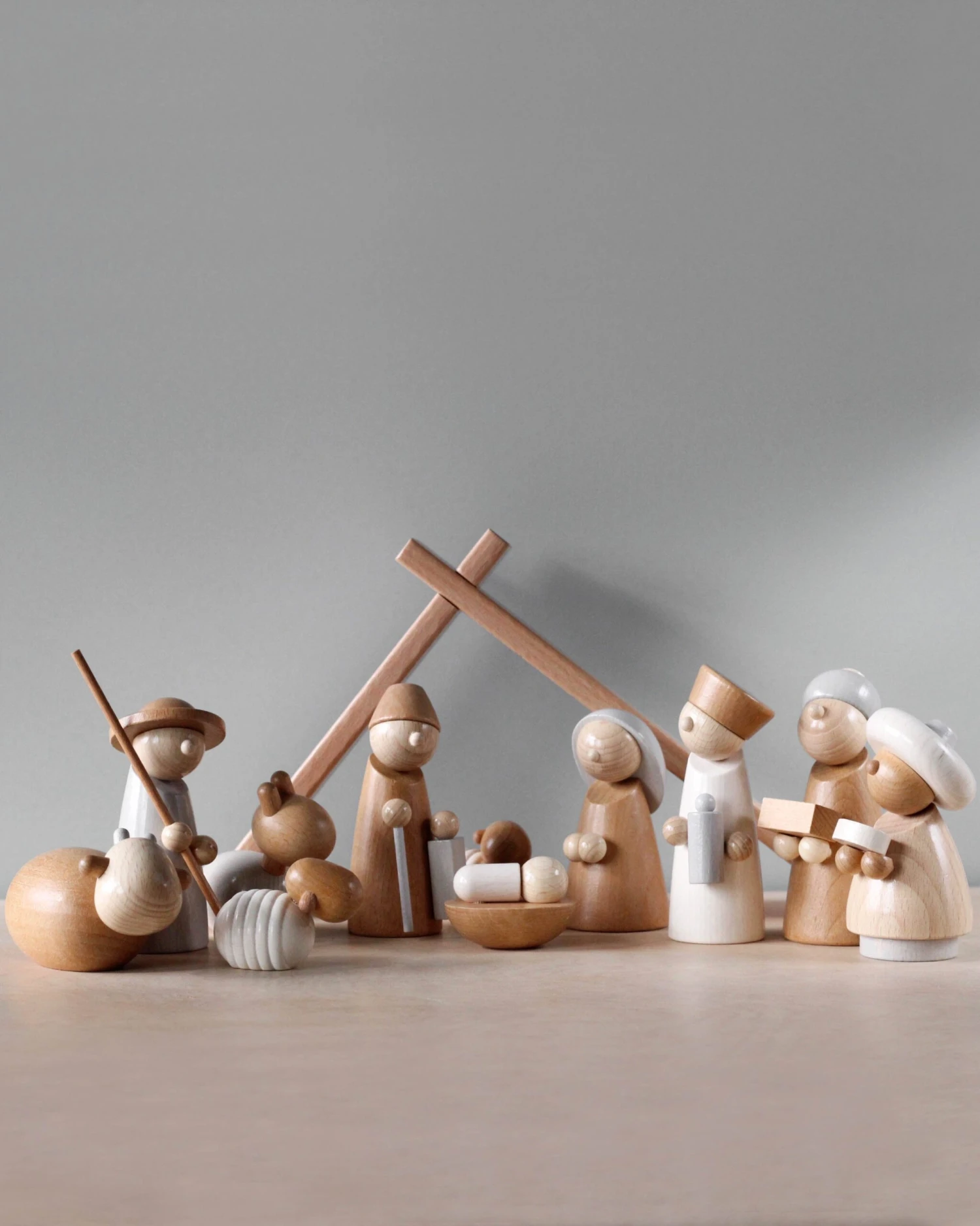 Made in Germany, this nativity set features 1 manger, 1 Mary figure, 1 Joseph figure, 1 nativity scene with baby Jesus, 3 kings, 1 shepherd, 2 sheep, 1 donkey, and 1 ox. The faces and bodies have been made both minimalist and expressive at the same time. Little ones can familiarize themselves with the Christmas story and reenact it in their own way. The colors have been deliberately toned down to give the figures a contemporary yet timeless appearance. Material: beech.