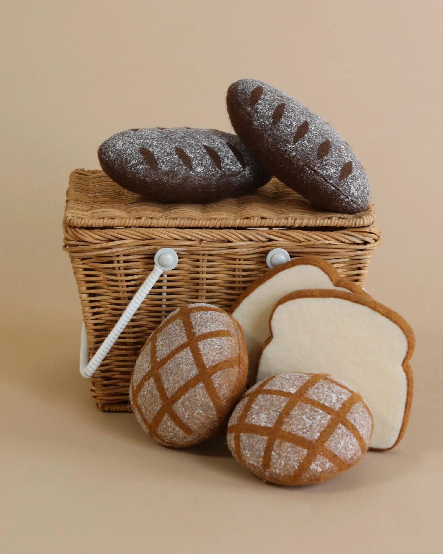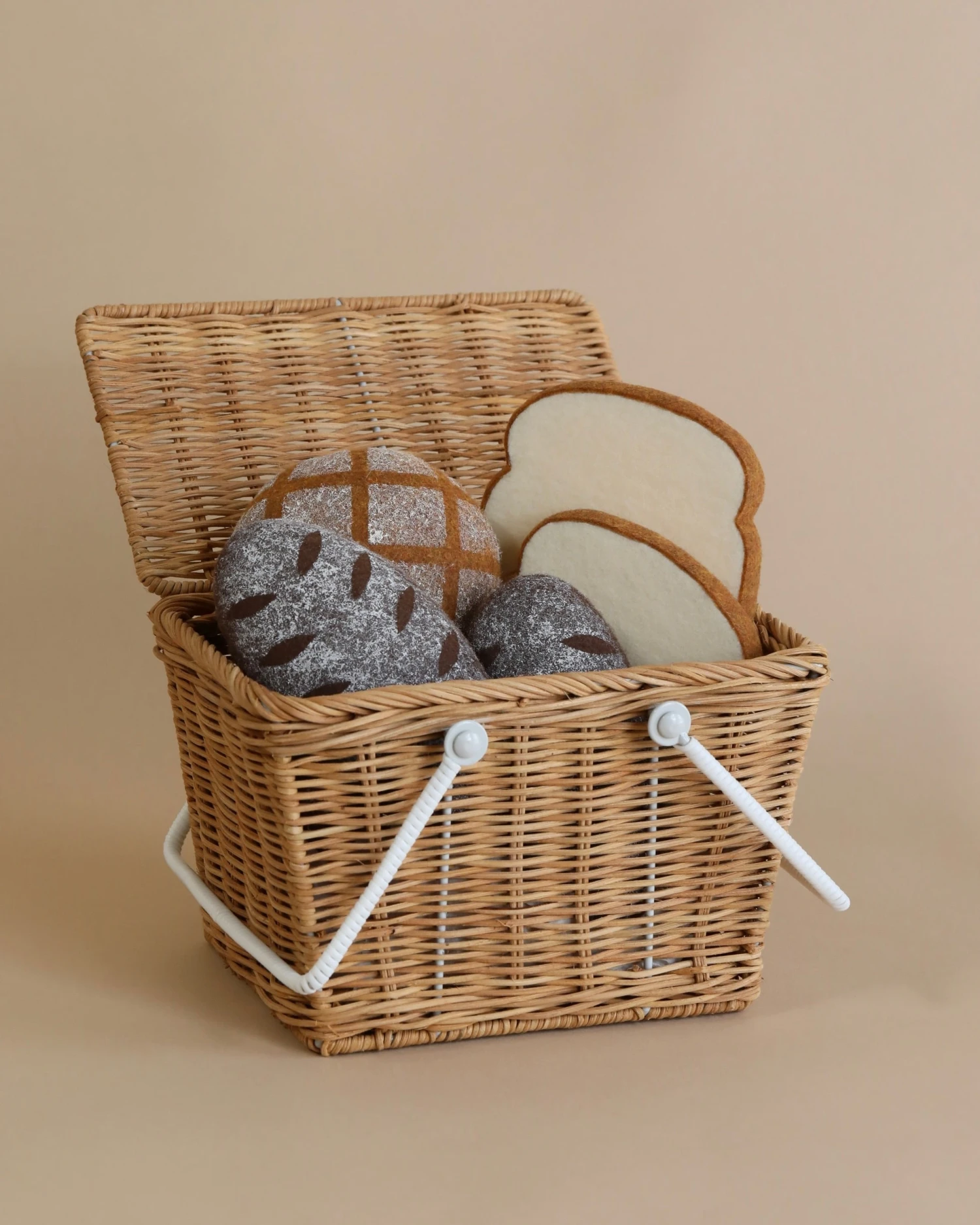 This basket includes an abundance of bread and pastries for the perfect pretend picnic. Each set comes with a rattan picnic basket and 6 felt bread pieces.