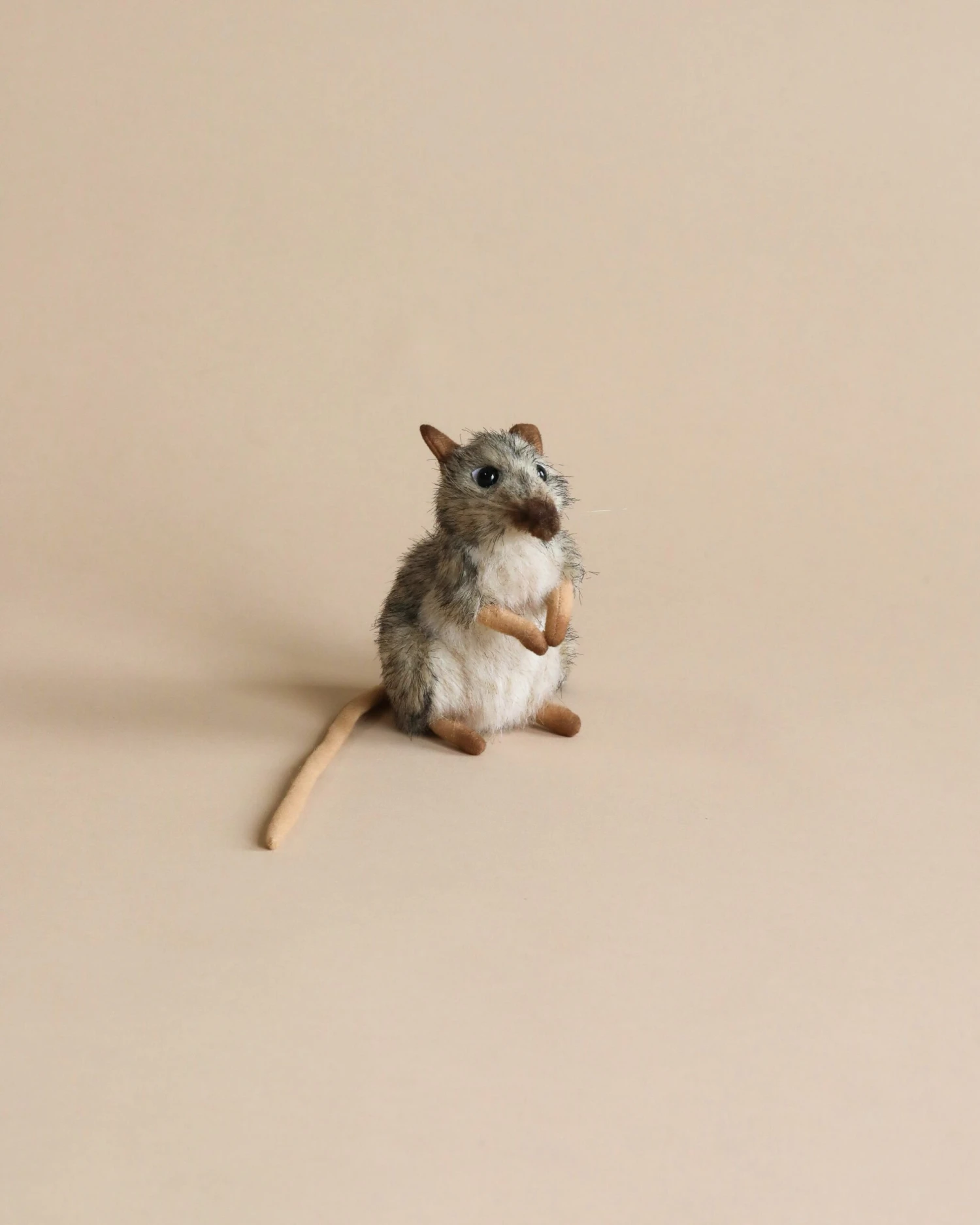Mus musculus domesticus. Found World-wide. Ancestor of the White mice widely used for scientific experimentation. Soft fur, yellowish gray on top w/ black. Eats any plants or animal material it can find. It is slightly less than 17cm. long including the tail which is 8cm. long. Domestic mice, because of better nutrition are often larger. Breed every 10-17 weeks. Producing 5-10 young.