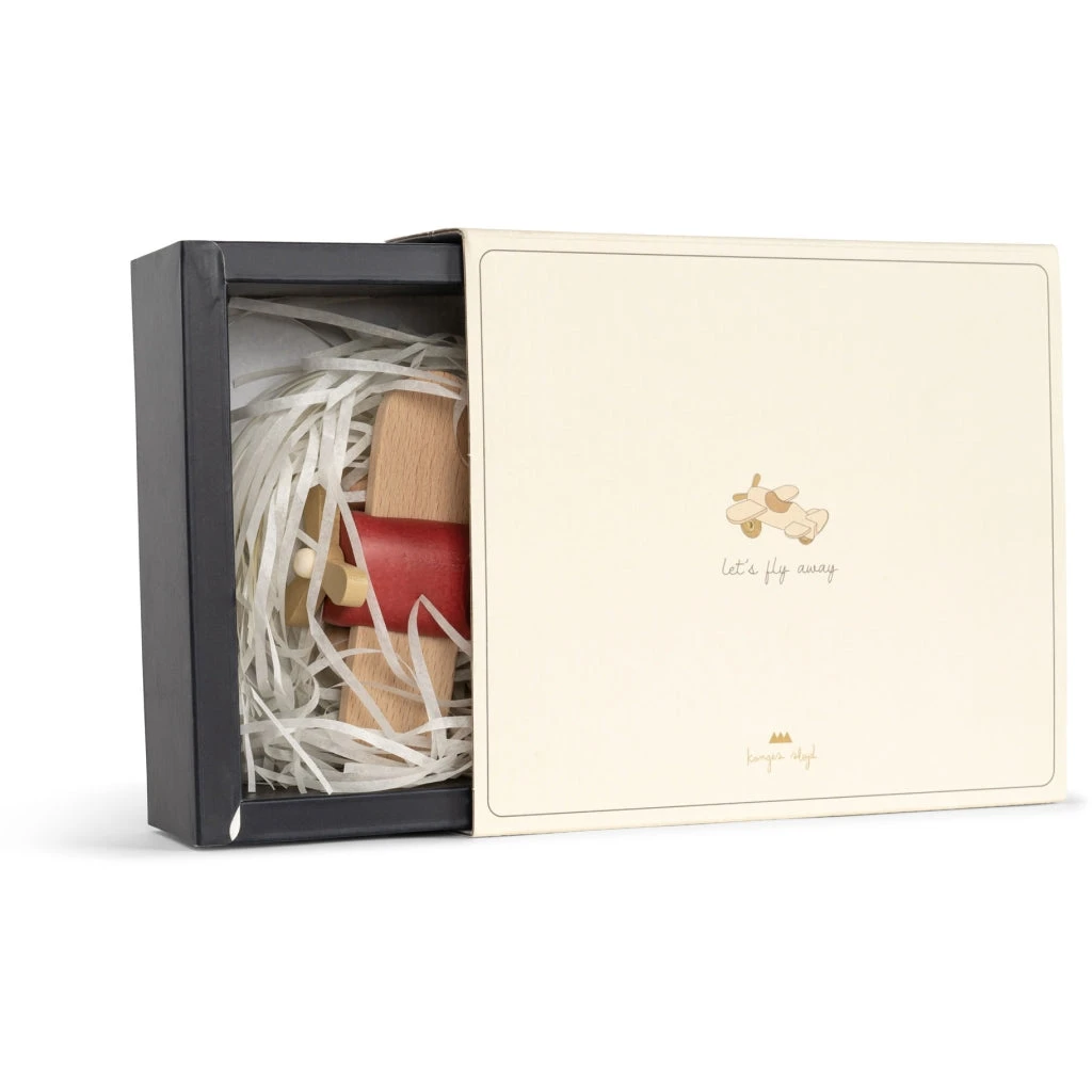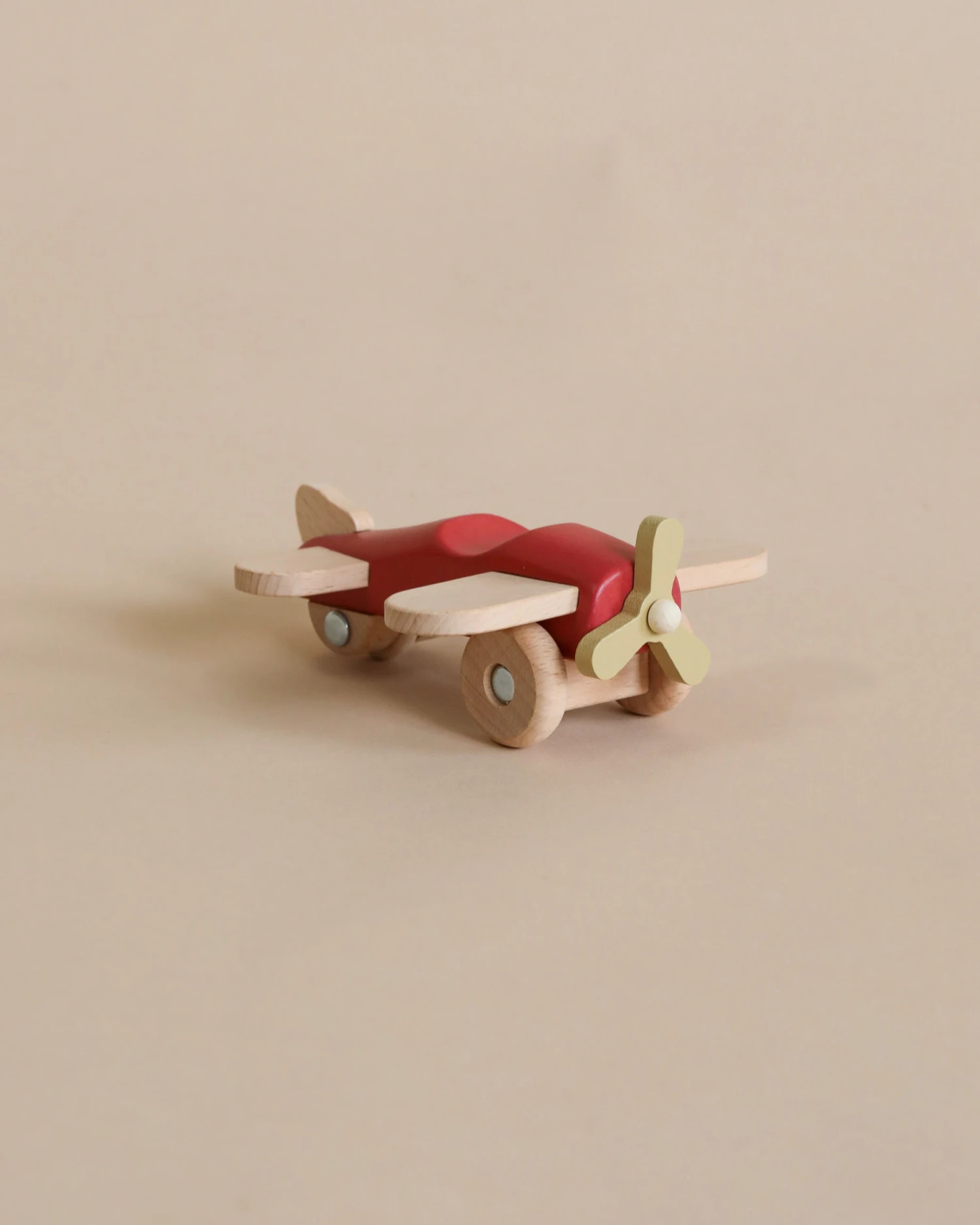 Airplane toy made with beechwood and non-toxic paint. Features movable wheels and propeller.
