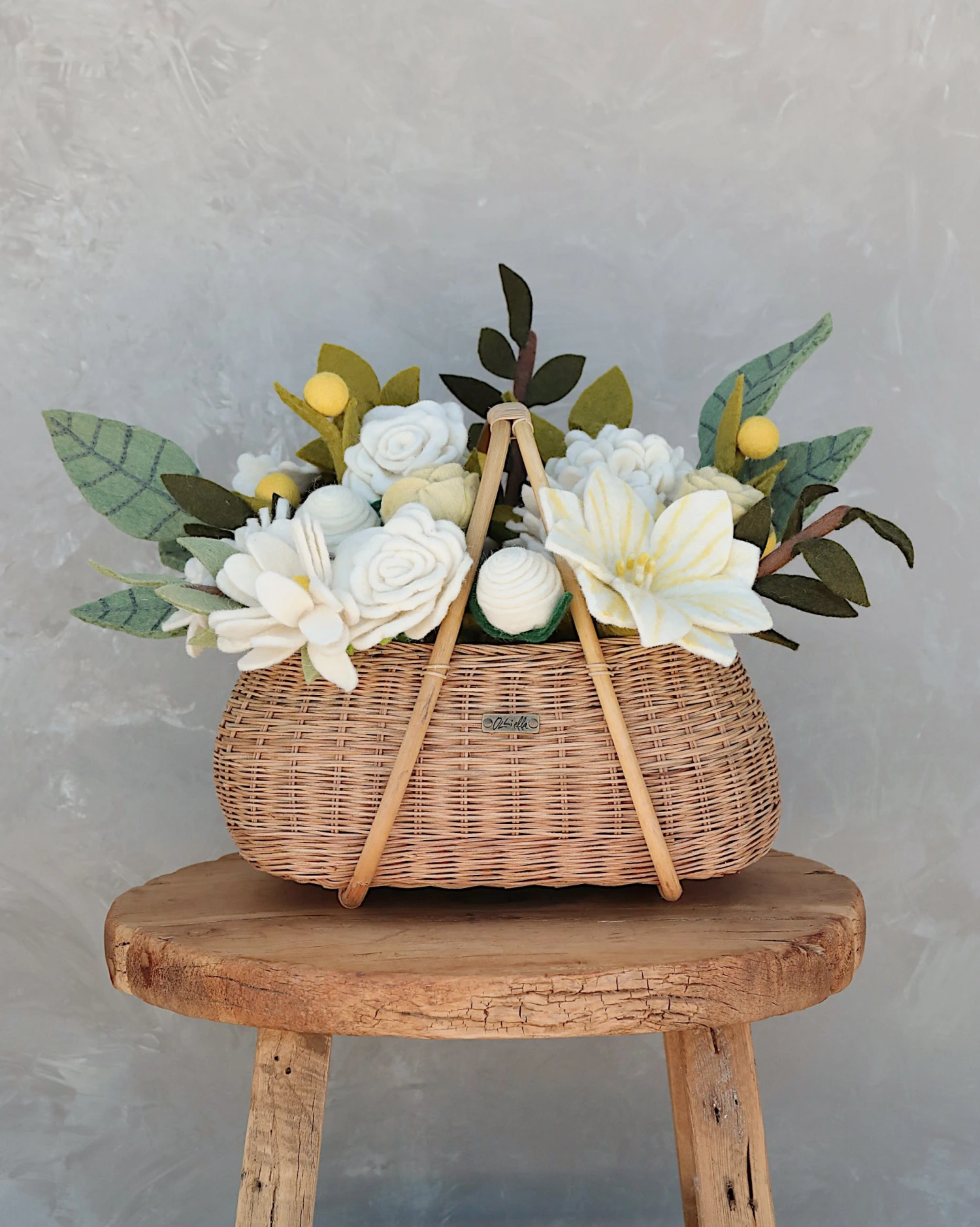 This set includes mixed felt flowers and leaves and a wicker basket.Â