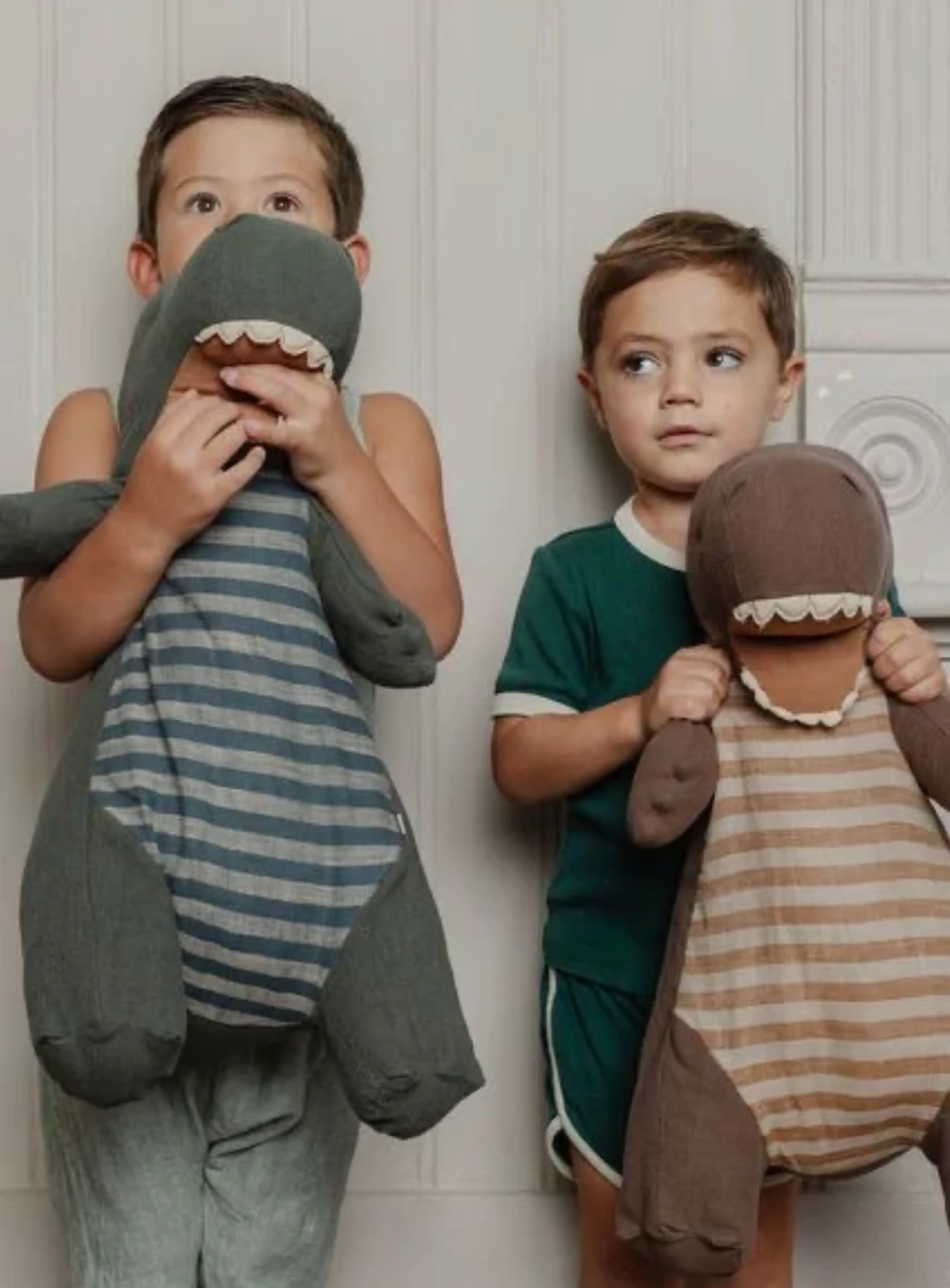 Look at this funny friend! A large Gantosaurus with big teeth has arrived and is ready to play with all of us. It is made in a soft mix of ramie and cotton, the striped stomach is made in a very nice blend of linen and cotton.