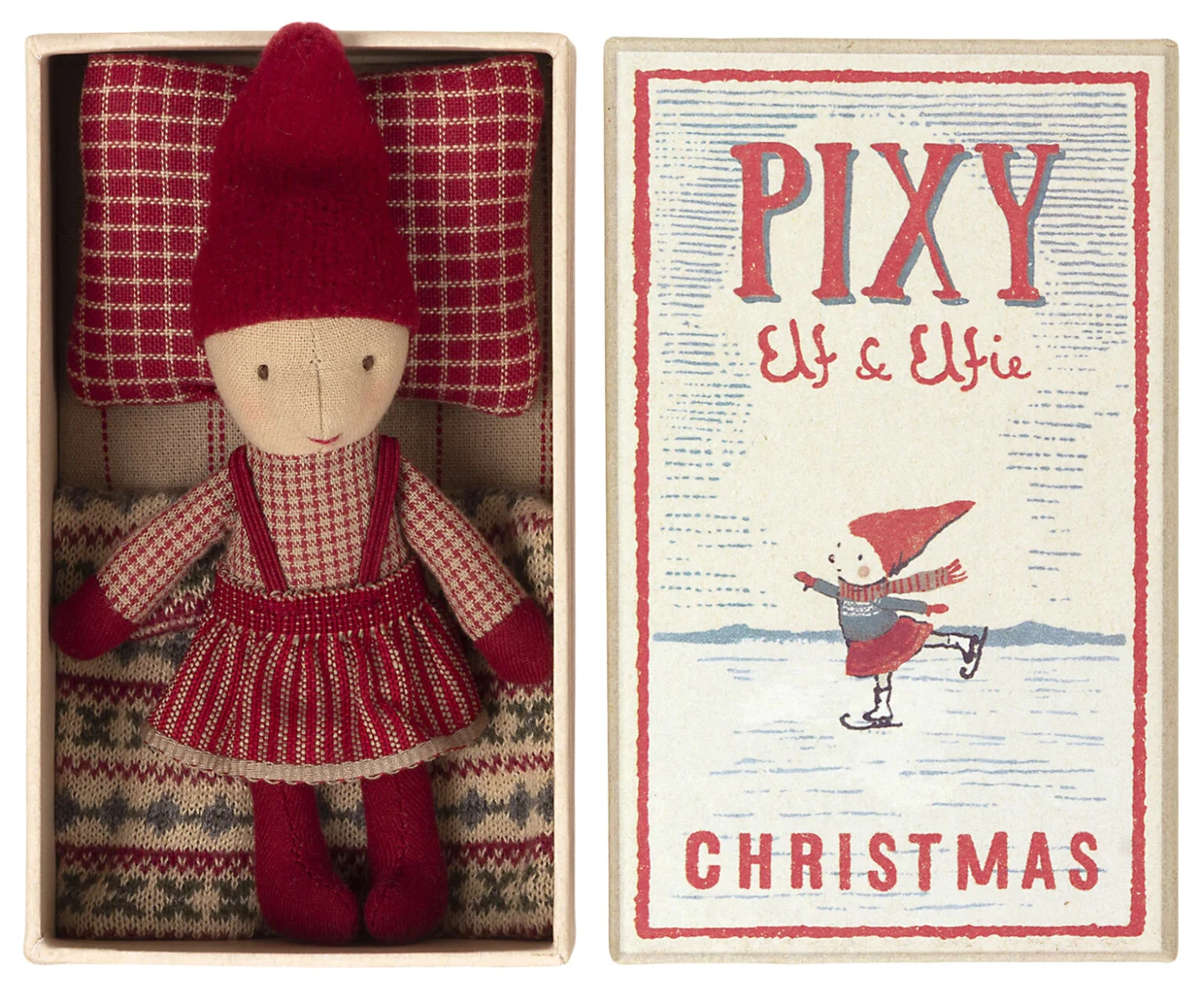 A lovely Christmas friend. Pixy Elfie comes in a beautiful matchbox with soft bedding. She fits perfectly into the Christmas story and the Maileg ginger bread house.