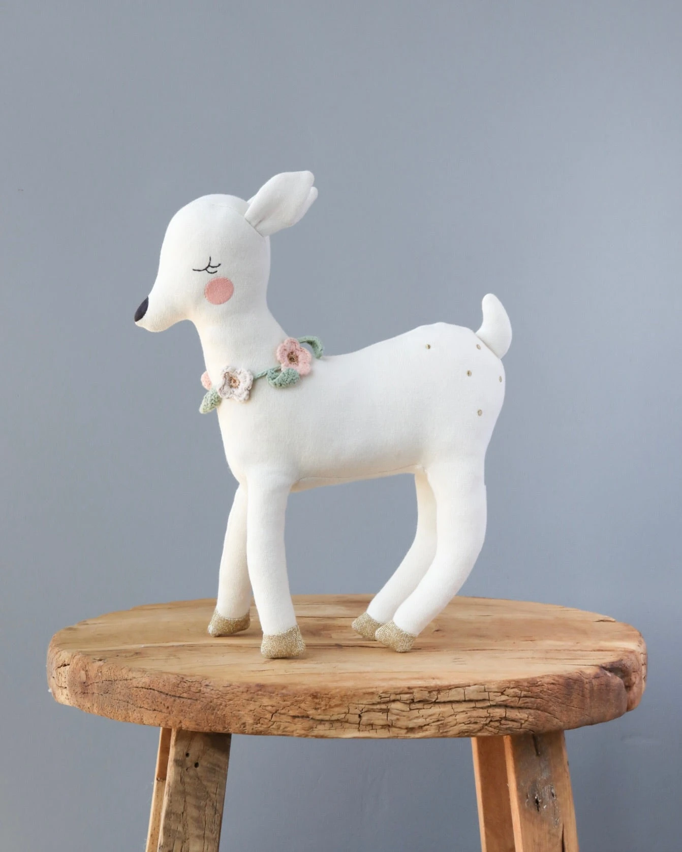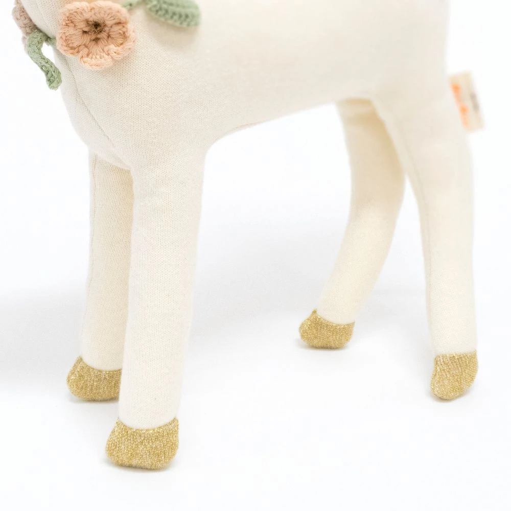 Blossom the baby deer is the perfect companion for a little one to cuddle or play with. Made from knitted organic cotton with adorable stitched features, gold hooves, and a beautiful crochet flower necklace.