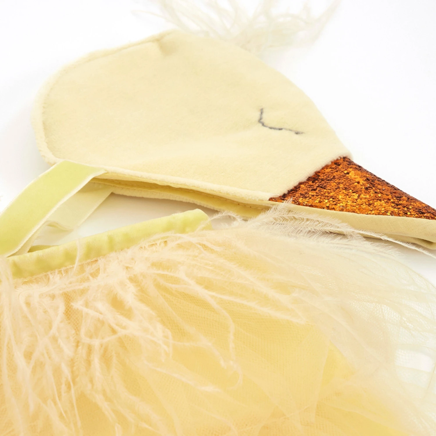 - The headpiece has a copper glitter fabric beak, stitched eye detail, a yellow velvet elastic strap, and an adorable tuft of yellow feathers