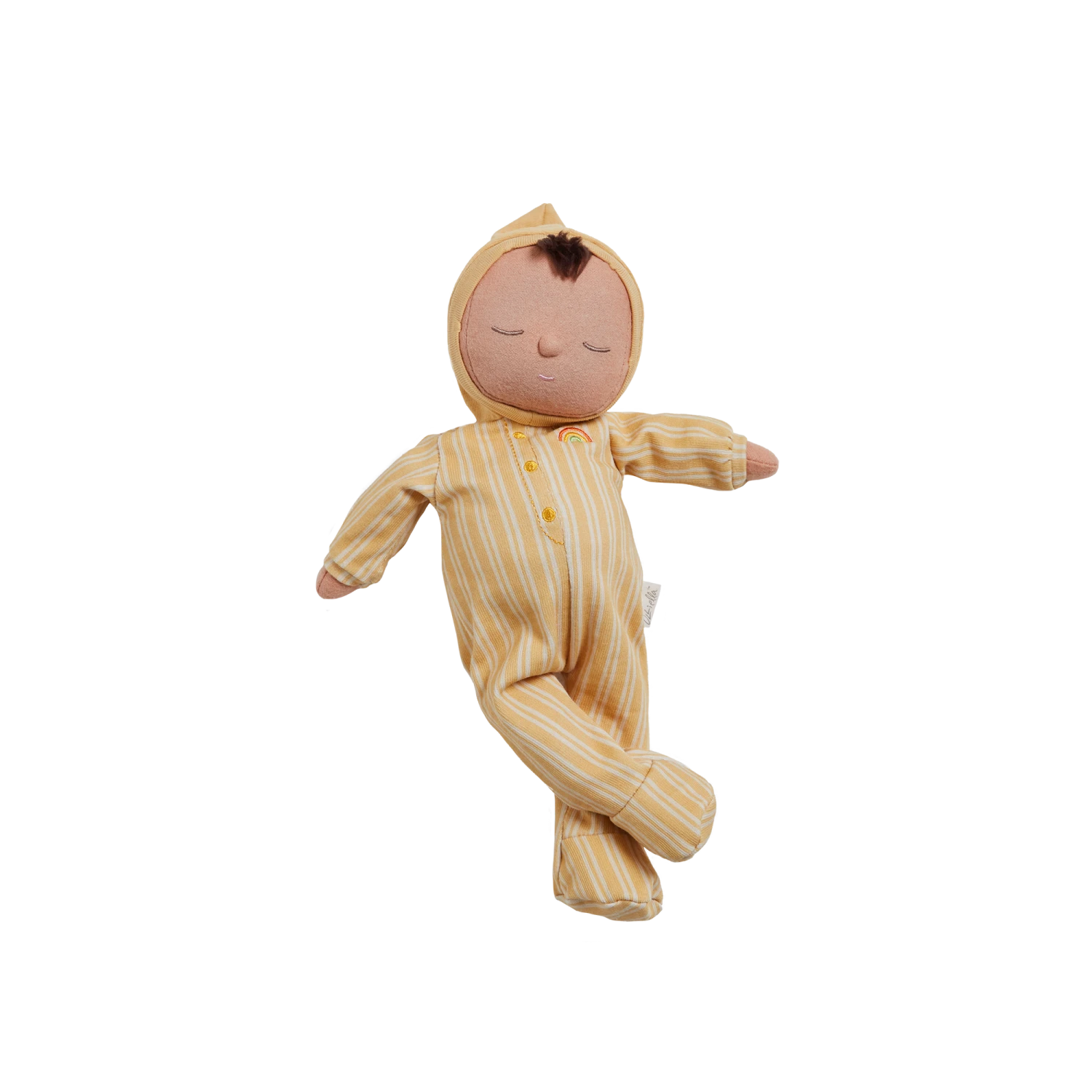 This limited-edition Daydream Dozy is made from 100% Cotton printed in our vintage inspired Goldie, print. Soft and precious, Pip Goldie is made for cuddles and play and can’t wait to snooze the days away with you! Pip Goldie is posable, made from super soft cotton and features the sweetest embroidered face with a little tuft of hair. Each Daydream Dozy Dinkum wears a non-removable suit complete with a rainbow right over their heart.