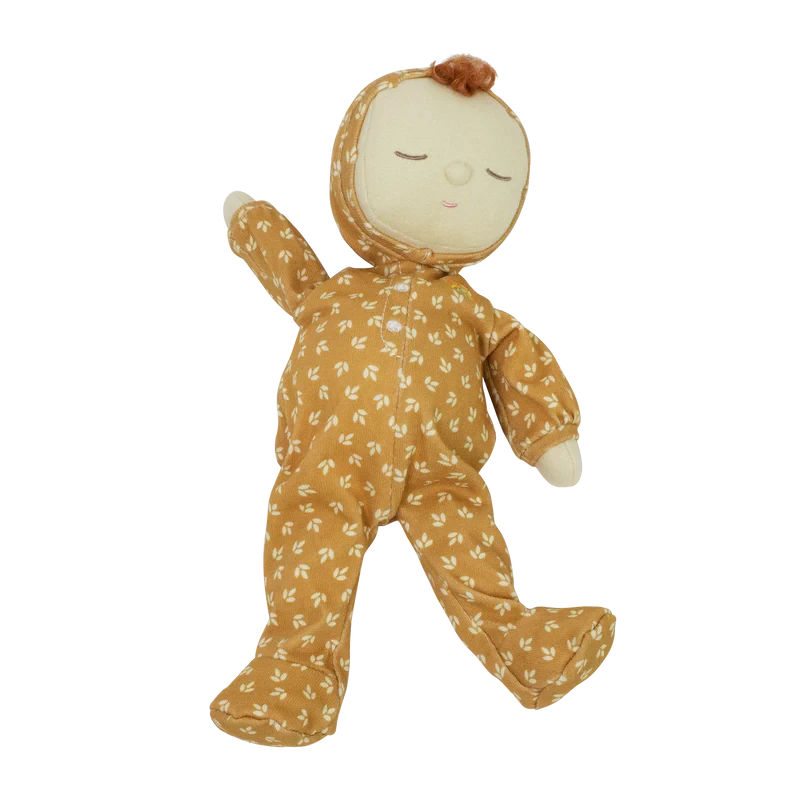 Dozy Bean is posable, made from super soft cotton, and features the sweetest embroidered face with a little tuft of hair. Each Daydream Dozy Dinkum wears a fixed suit with a rainbow right over their heart.
