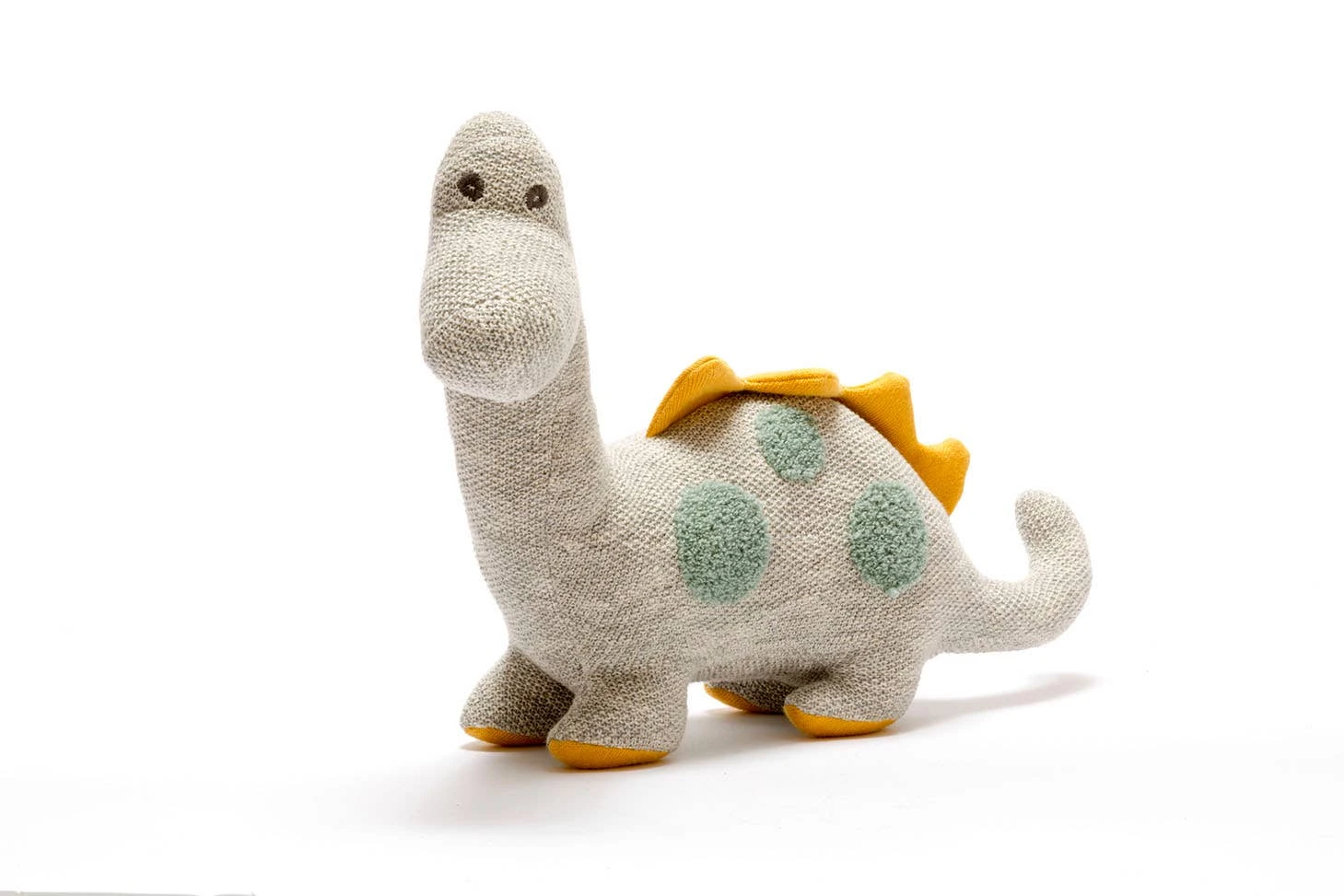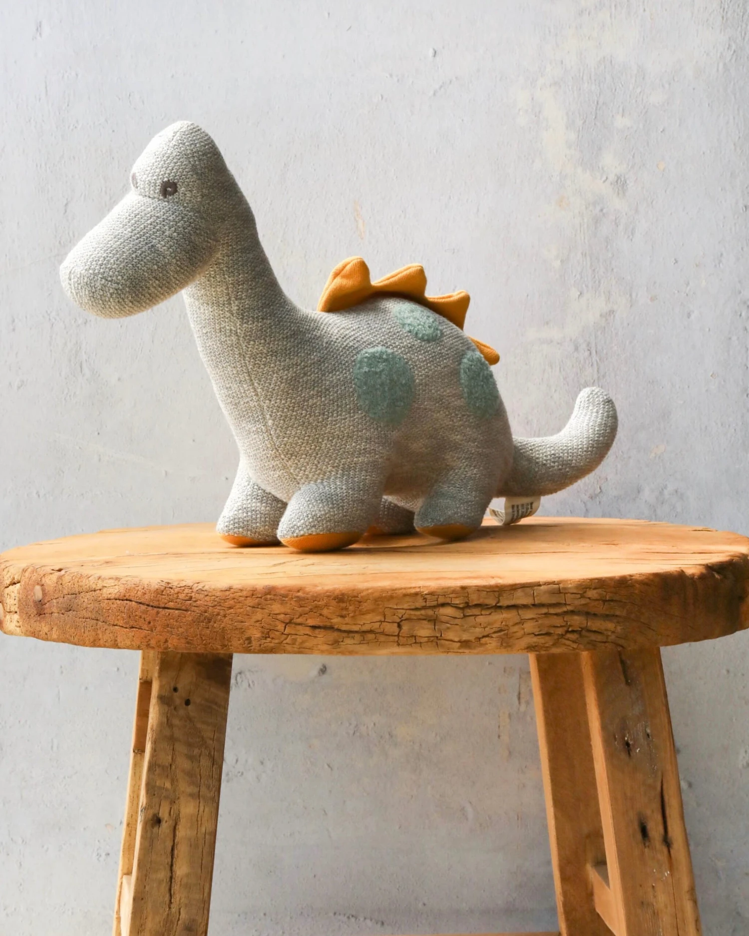 This knitted dinosaur toy is made from tactile organic cotton. Soft grey with raised teal spots and mustard spikes.
