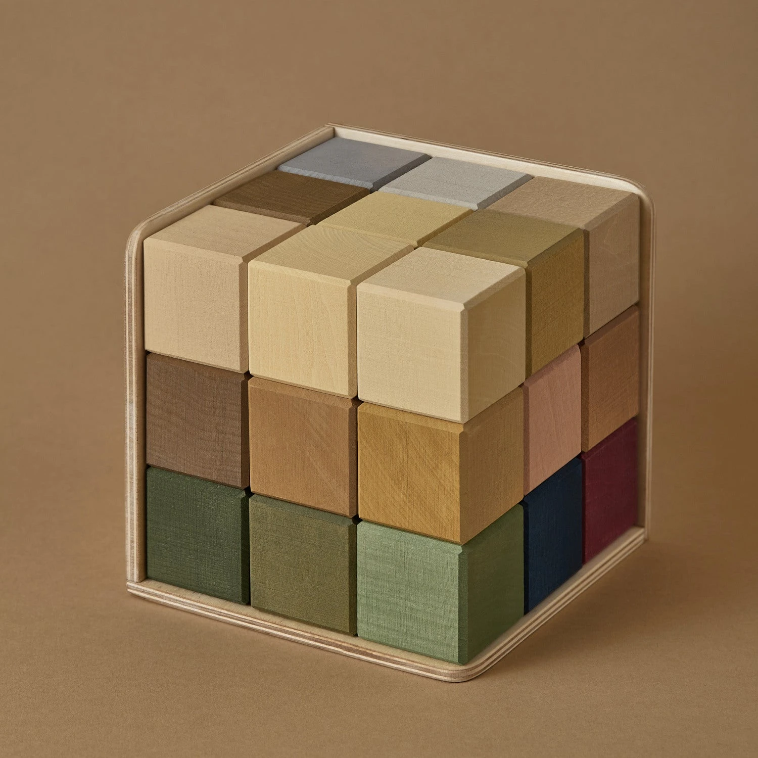 This set contains 27 cubes that are painted in beautiful colors with non-toxic paint. They’re all nestled neatly in a storage tray.