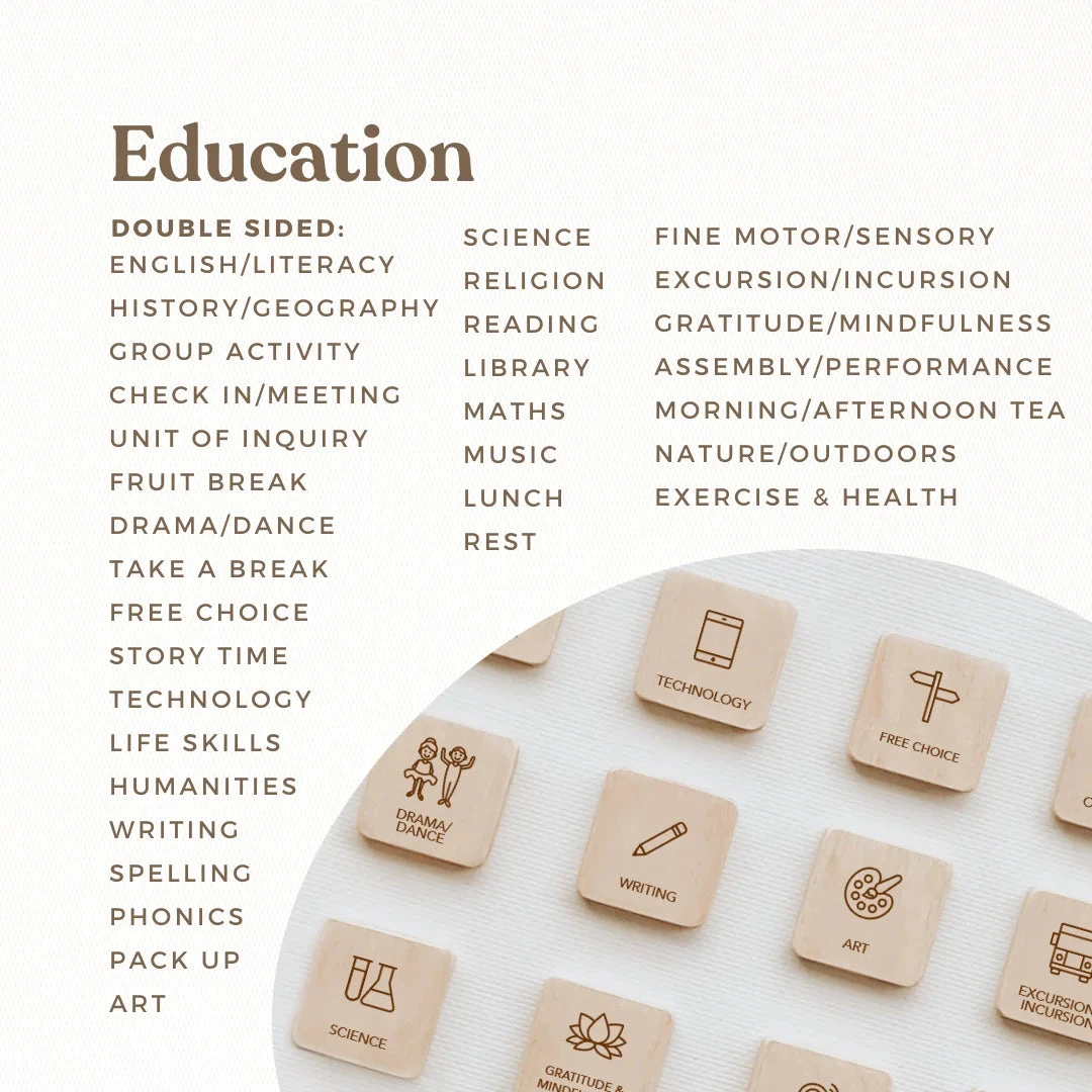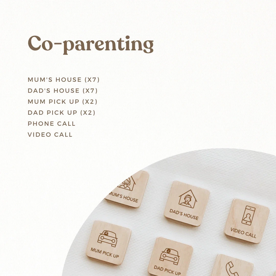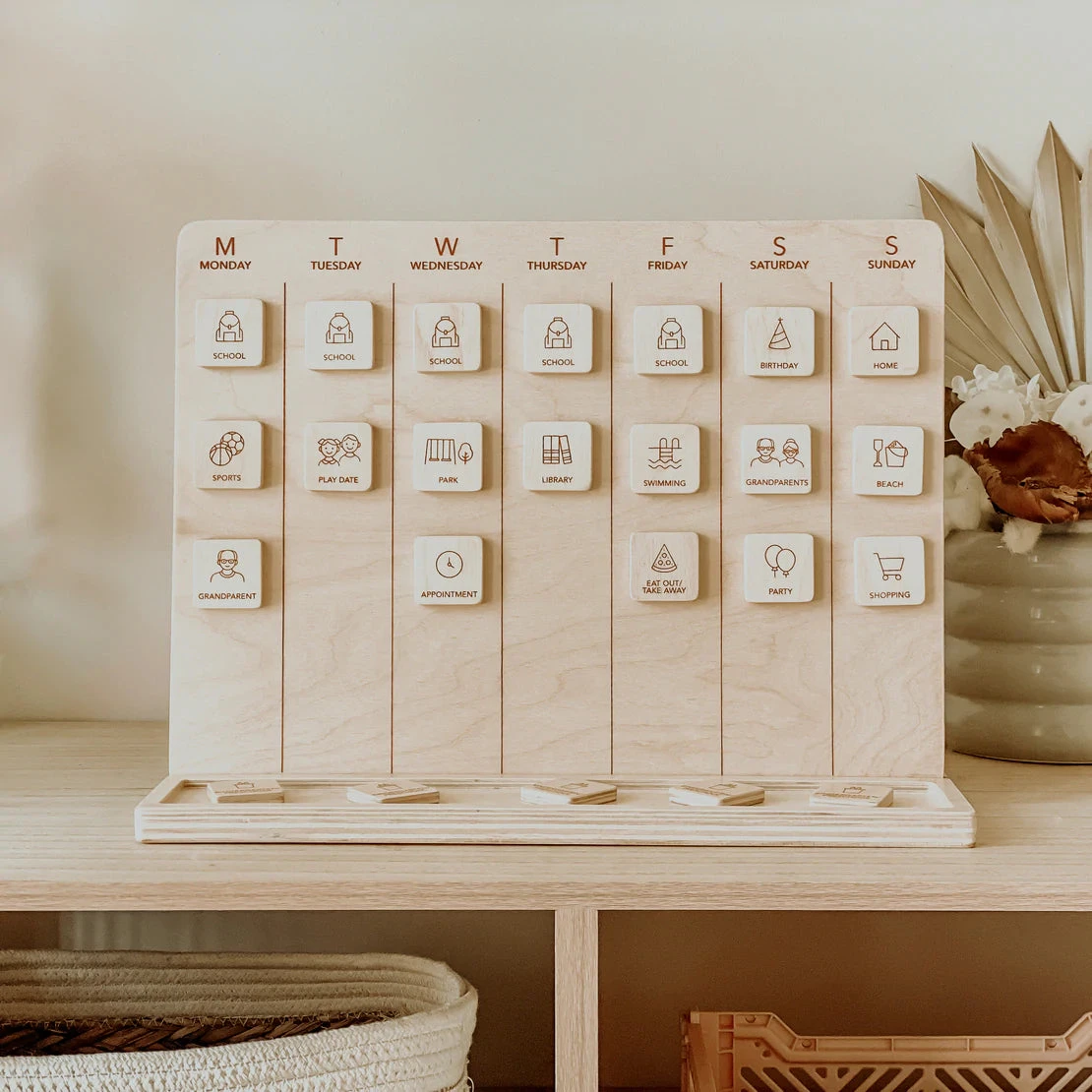 Starter set includes: 1 wooden backing board, 1 wooden base, 4 wooden shift tiles (today, morning, afternoon & evening) and the following tiles: School (side A), Kindergarten/Preschool (side B), Grandparents (side A), Grandparent (side B), swimming, play date, shopping, home, sports, party, birthday, appointment, library, park, eat out/ takeaway & beach.