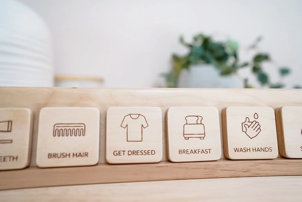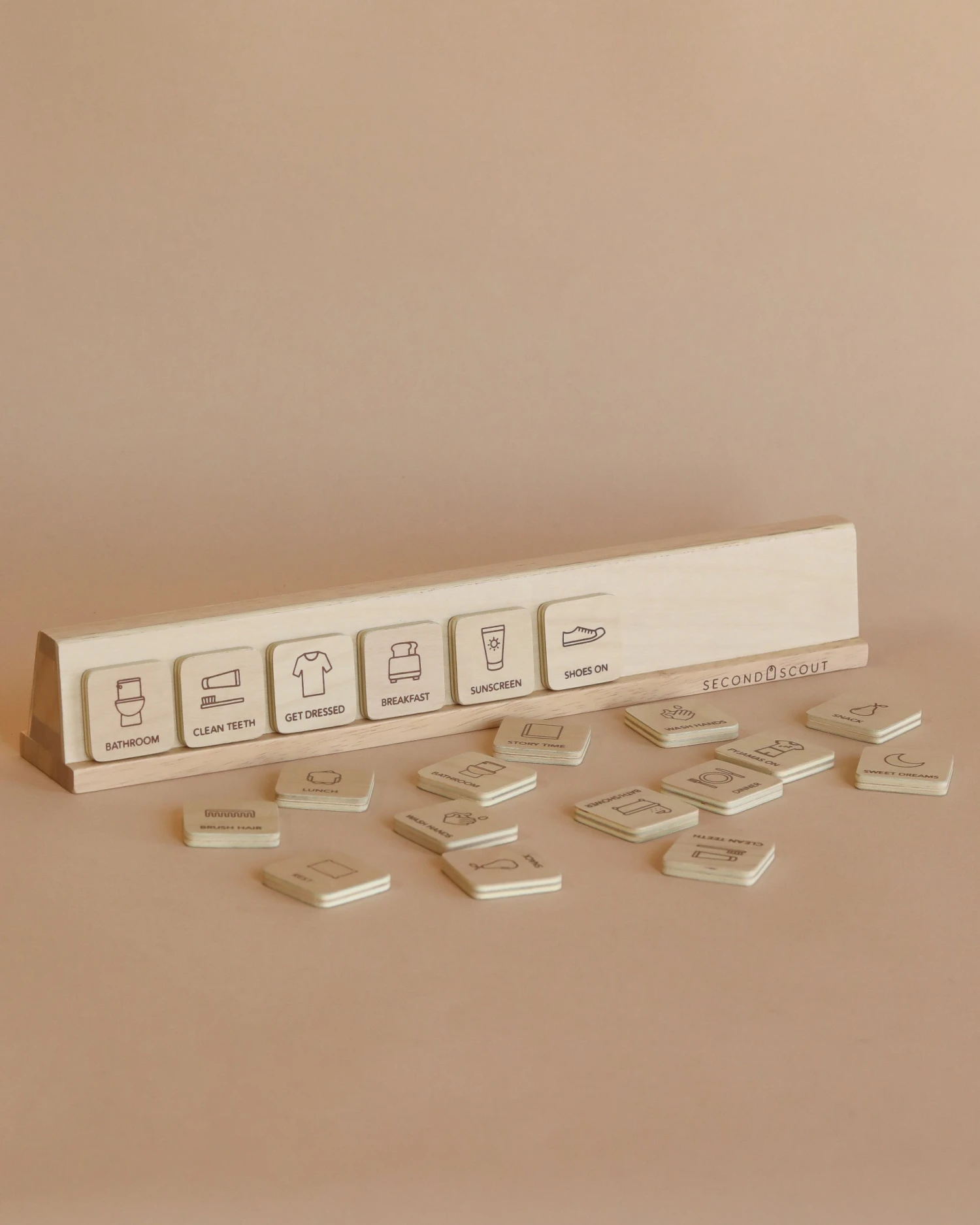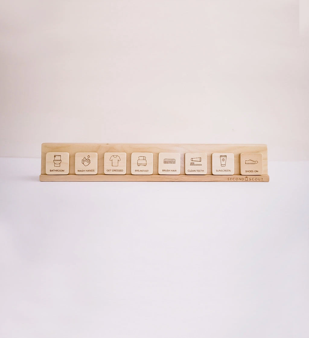 Morning tiles – breakfast, bathroom, clean teeth, get dressed, brush hair, sunscreen, shoes on, snack, wash hands, lunch