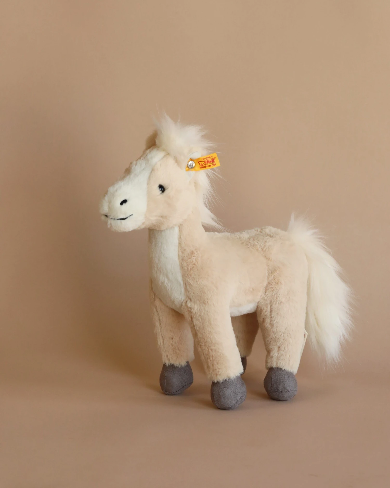 This Soft Cuddly Friends Gola horse is absolutely adorably and incredibly irresistible! With her silky beige and white plush, fuzzy mane and tail, and her sweet face, Gola spreads happiness everywhere she roams. This lovable little horse invites you to snuggle up and dream with her – of flowering meadows and wild rides into the world of imagination! It’s lovingly handmade from premium-grade materials by Steiff’s skilled artisans. Gola proudly wears the world famous “Button in Ear” trademark, symbol of highest quality. From the company that invented the Teddy bear in 1902.