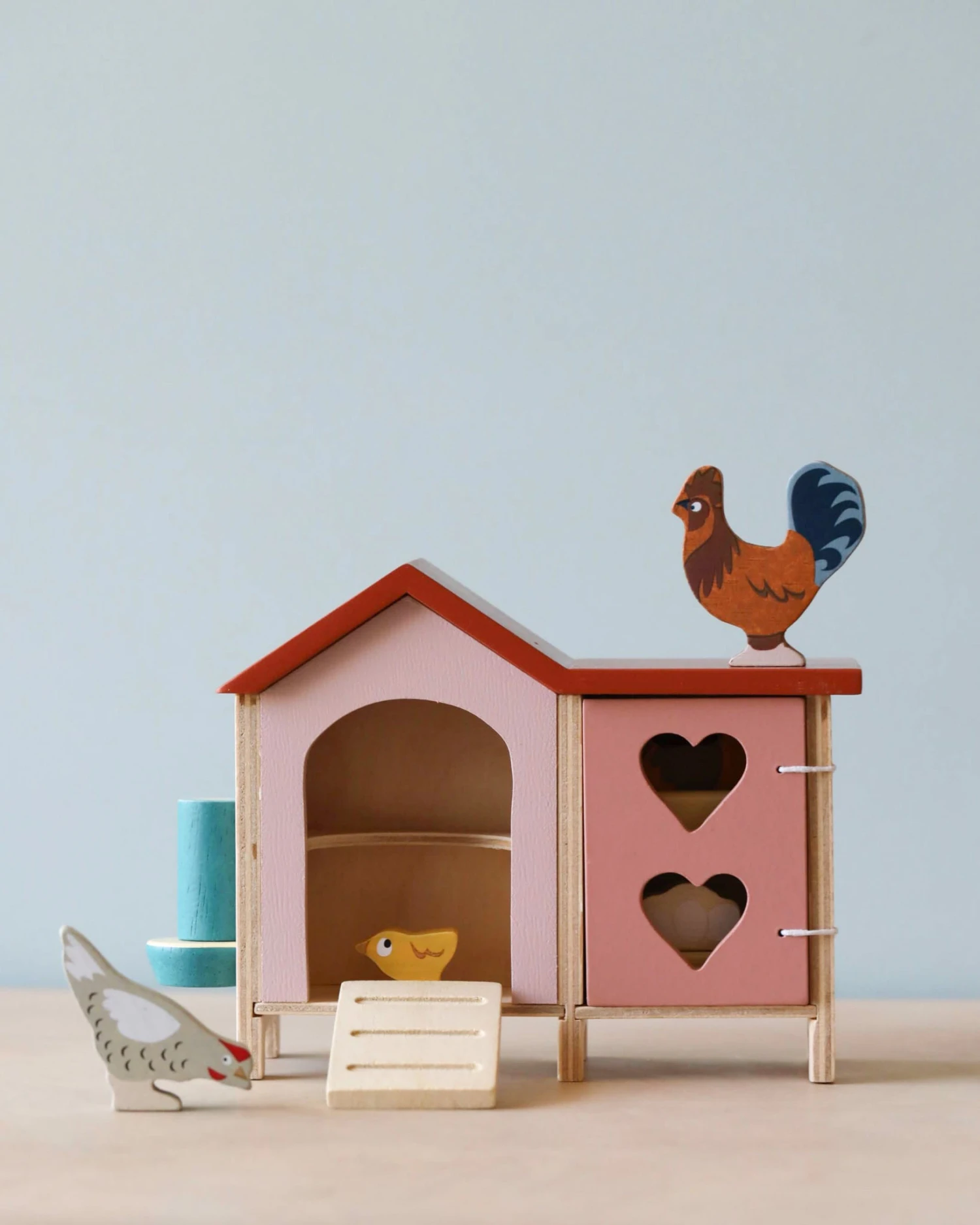 A sweet wooden chicken coop and family; a rooster, 2 hens, a little chick, freshly laid eggs, 2 nests, and a feeding trough.
