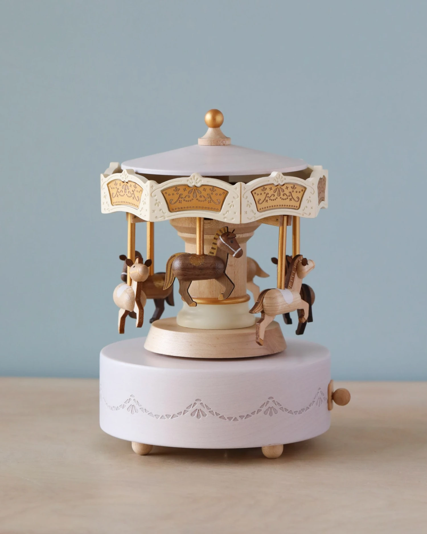Combining nostalgia and a classic design, this hand cranked music box makes a great addition to any any room as a decoration on a shelf. The on/off toggle allows the music to start and turn off easily, while the winding mechanism rotates the music box around.Â