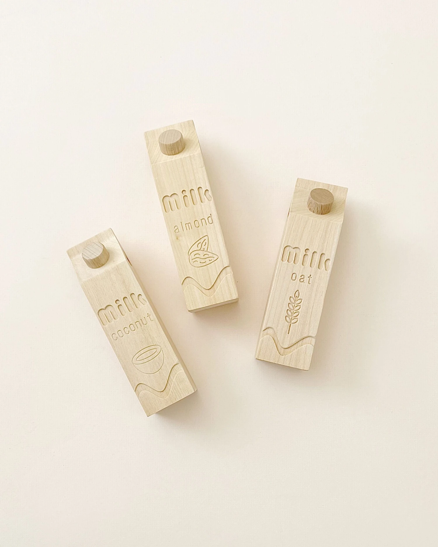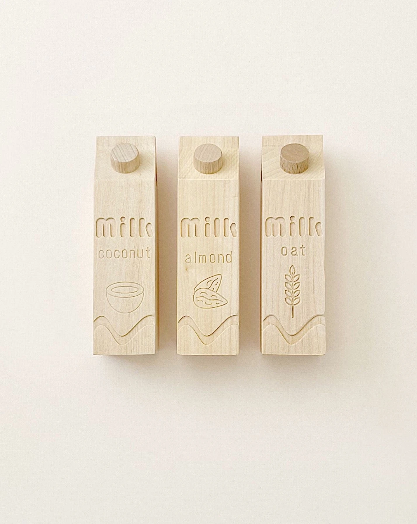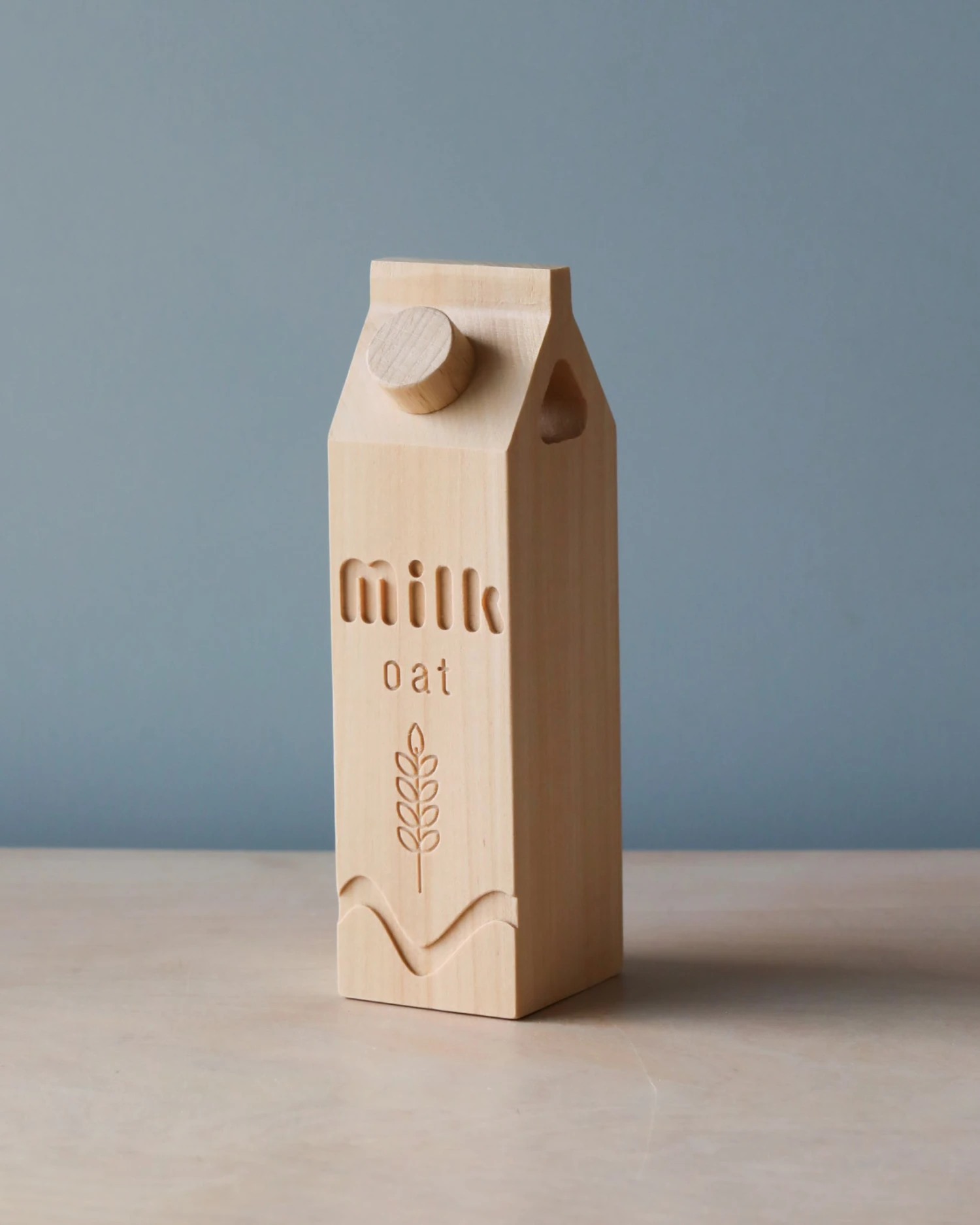 Made of linden wood and coated with natural biofa oil, this dairy-free milk is a great option for pretend play in the kitchen!