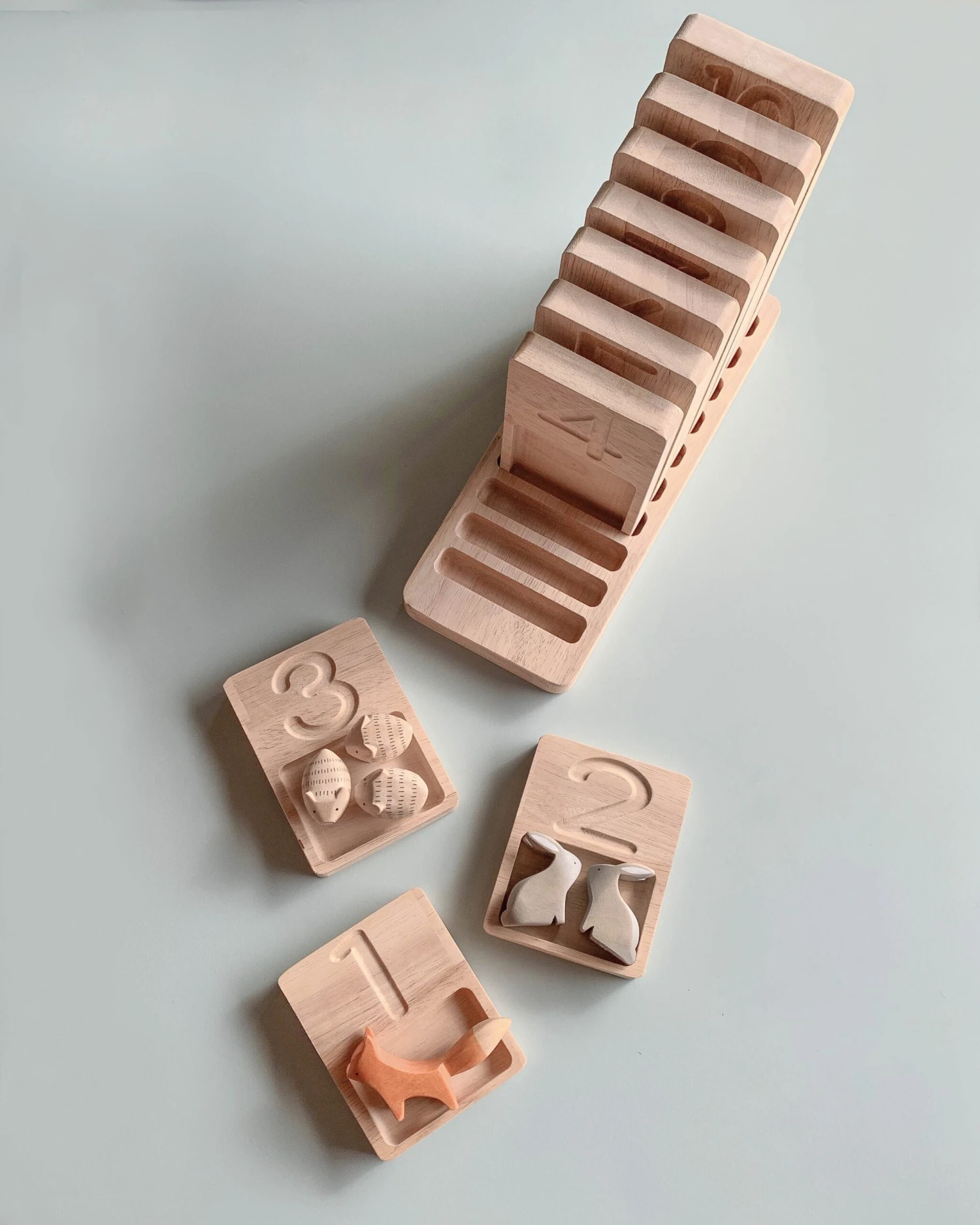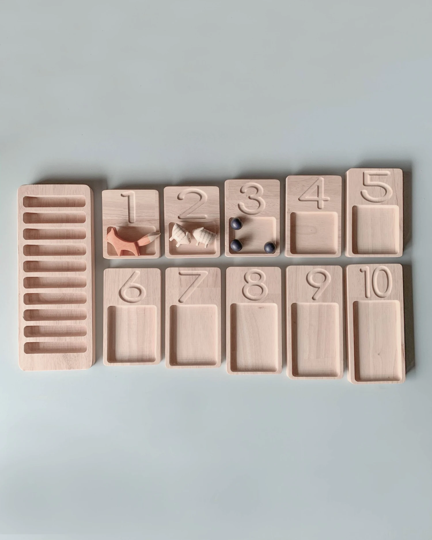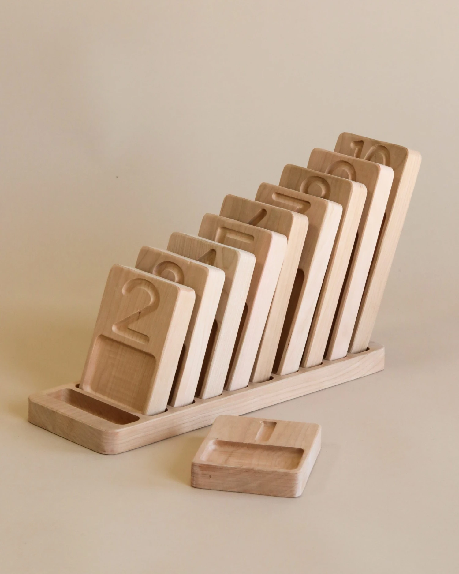 Made of beech wood, this set contains 10 number boards and a display base. Using child-safe objects from around the house, you can use the trays to visually teach little ones about numbers. Each board is slightly larger than the one before it, to allow more room for additional items. The carved out numbers above trays are also a great tracing tool.