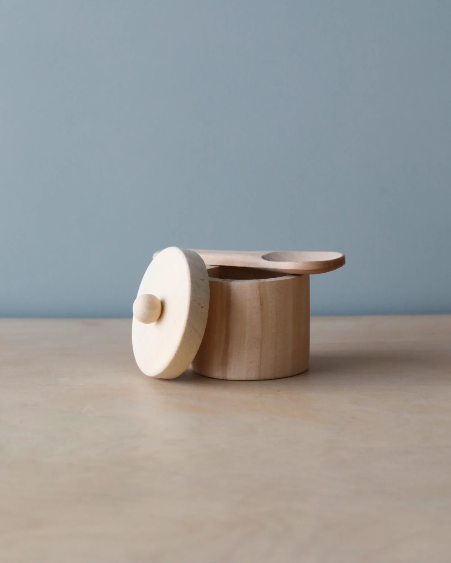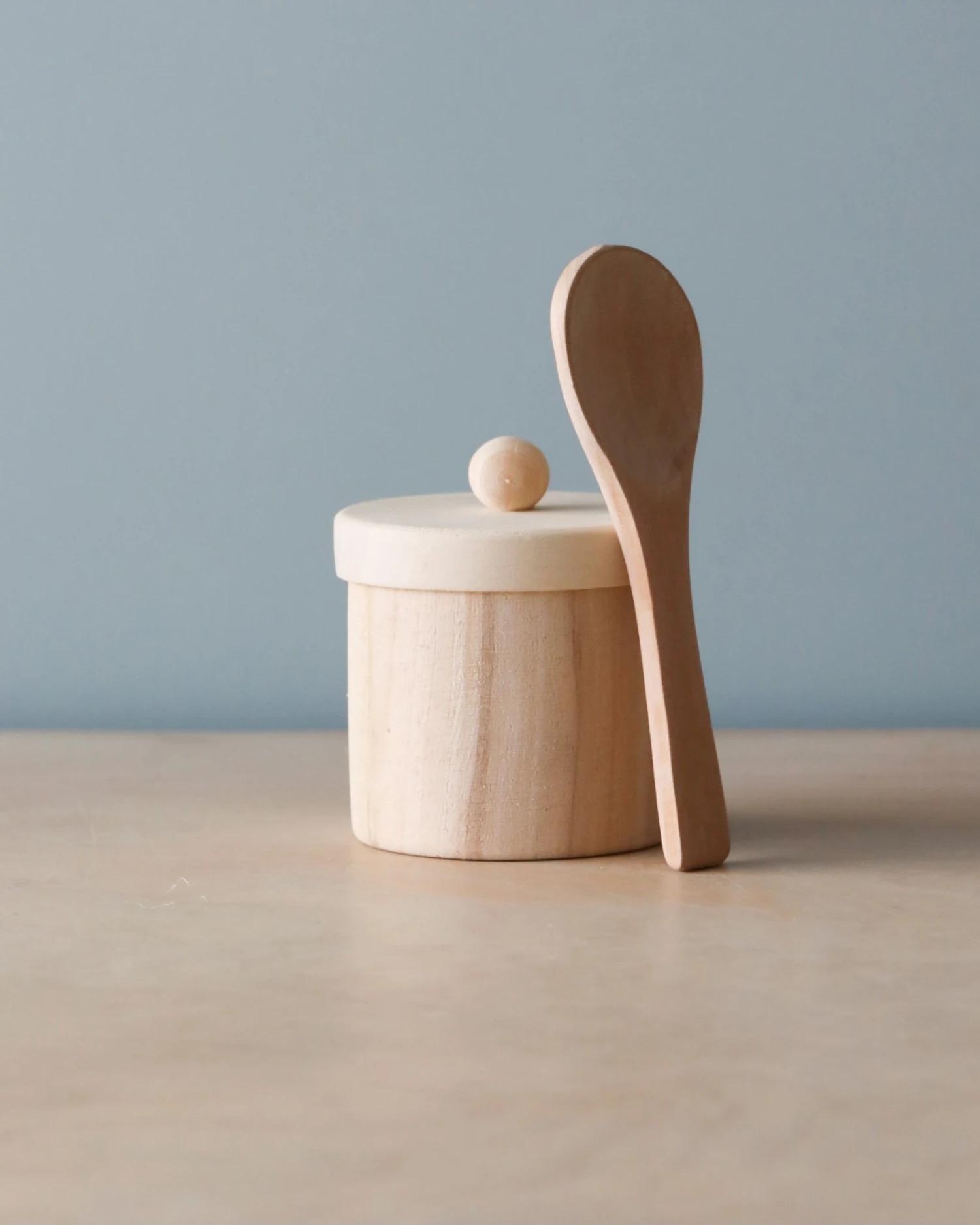 The loveliest little jar and spoon set crafted from 100% Pinewood, the Feeding Set is smooth to the touch and made with little hands in mind. With an easily removable lid, and soft rounded spoon, this feeding set will provide hours of imaginary play for the little chef.